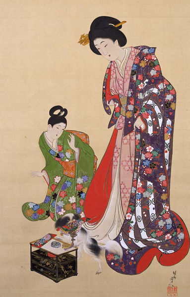 UAG美人画研究室では、浮世絵、日本絵画、日本画などで「美人画」と総称される絵画と、油彩画などでみられる「女性像」を中心に、美人画関連の展覧会に出品実績のある作品を対象に掲載しています。また、掲載対象作家は、明治45年(1912)以前の出生者としました。トップ画像は池田輝方「幕間」